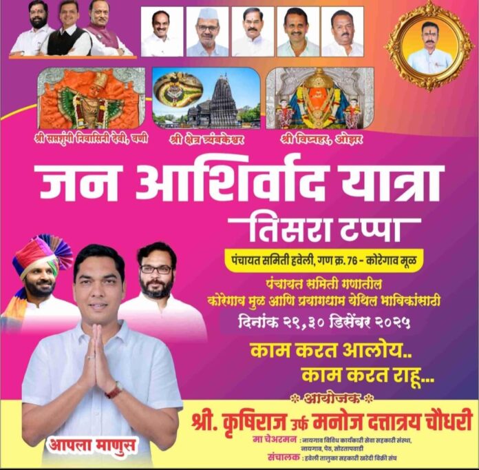 कर्तृत्व, दातृत्व, वक्तृत्व, निष्ठा आणि माणुसकी या पंचगुणांच्या संगमावर उभे असलेले गुणसंपन्न व्यक्तिमत्त्व म्हणून कोरेगावमुळ पंचायत समिती गणाचे इच्छुक उमेदवार कृषीराज उर्फ मनोज दत्तात्रय चौधरी यांच्याकडे पाहताना मन आनंदाने आणि प्रेमाने भरून येते. हवेली तालुक्यातील नायगाव येथील सामाजिक, राजकीय, कृषी, सहकार, कला, शैक्षणिक, आध्यात्मिक वसा आणि वारसा लाभलेल्या कुटुंबातील कोरेगावमुळ पंचायत समिती गणाचे इच्छुक उमेदवार कृषीराज उर्फ मनोज दत्तात्रय चौधरी यांनी जनमानसाशी नाते जोडत, कोरेगावमुळ पंचायत समिती गणात प्रेम मिळवून गणातील जेष्ठ नागरिक, महिला, तरुण, युवतीशी संवाद साधत मित्रपरिवार व तालुक्यातील जेष्ठ नेतृत्वाच्या मार्गदर्शनाखाली तिसऱ्या टप्प्यांत ‘जन आशीर्वाद यात्रा’ ‘श्री सप्तशृंगी निवासिनी देवी वणी’, ‘श्रीक्षेत्र त्र्यंबकेश्वर’, ‘श्री.विघ्नहर ओझर’ अशाप्रकारे यात्रा सोमवार दि.२९ डिसेंबर २०२५ ते दि.३० डिसेंबर २०२५ अशी दोन दिवसांची असणार आहे.